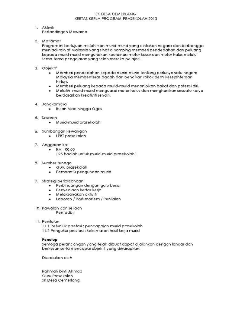 Contoh Kertas Kerja Pertandingan Mewarna Prasekolah
